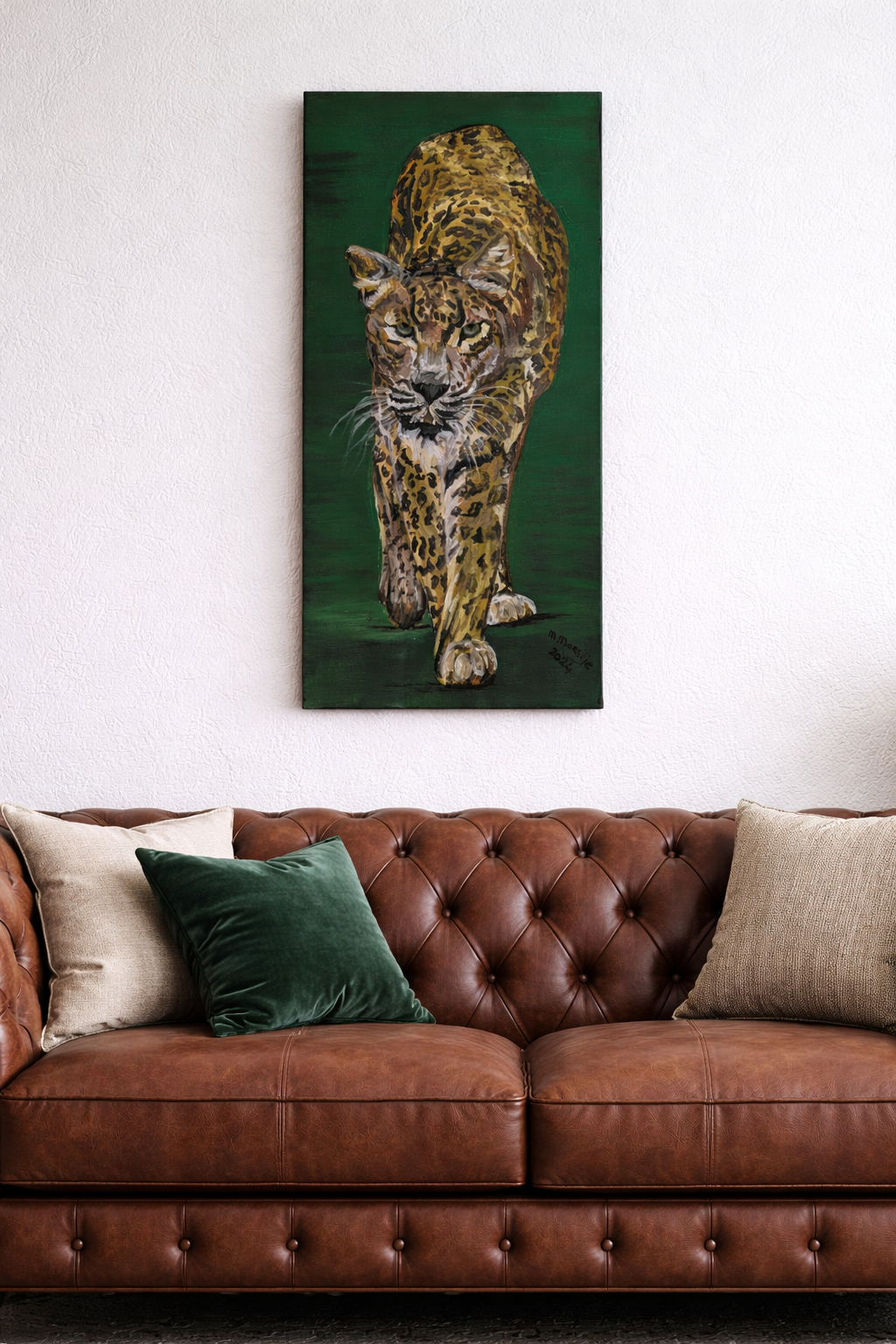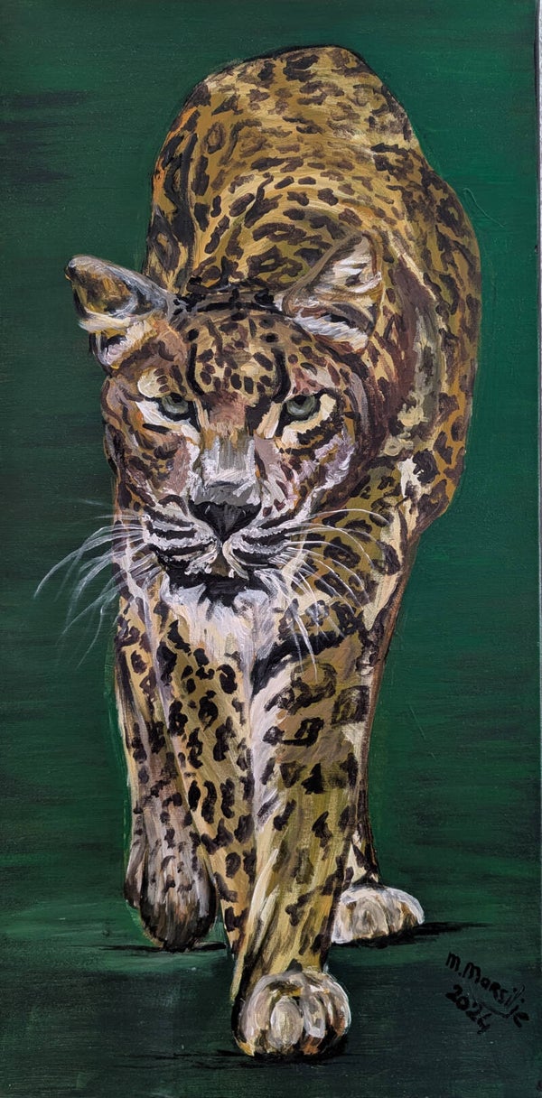 Dit indrukwekkende originele schilderij (80x40 cm) toont een luipaard in een moment van pure focus. Geruisloos, vastberaden en vol spanning beweegt hij zich naar voren. Zijn blik vertelt een verhaal van kracht, elegantie en instinct - een ode aan de ongetemde schoonheid van wilde dieren.