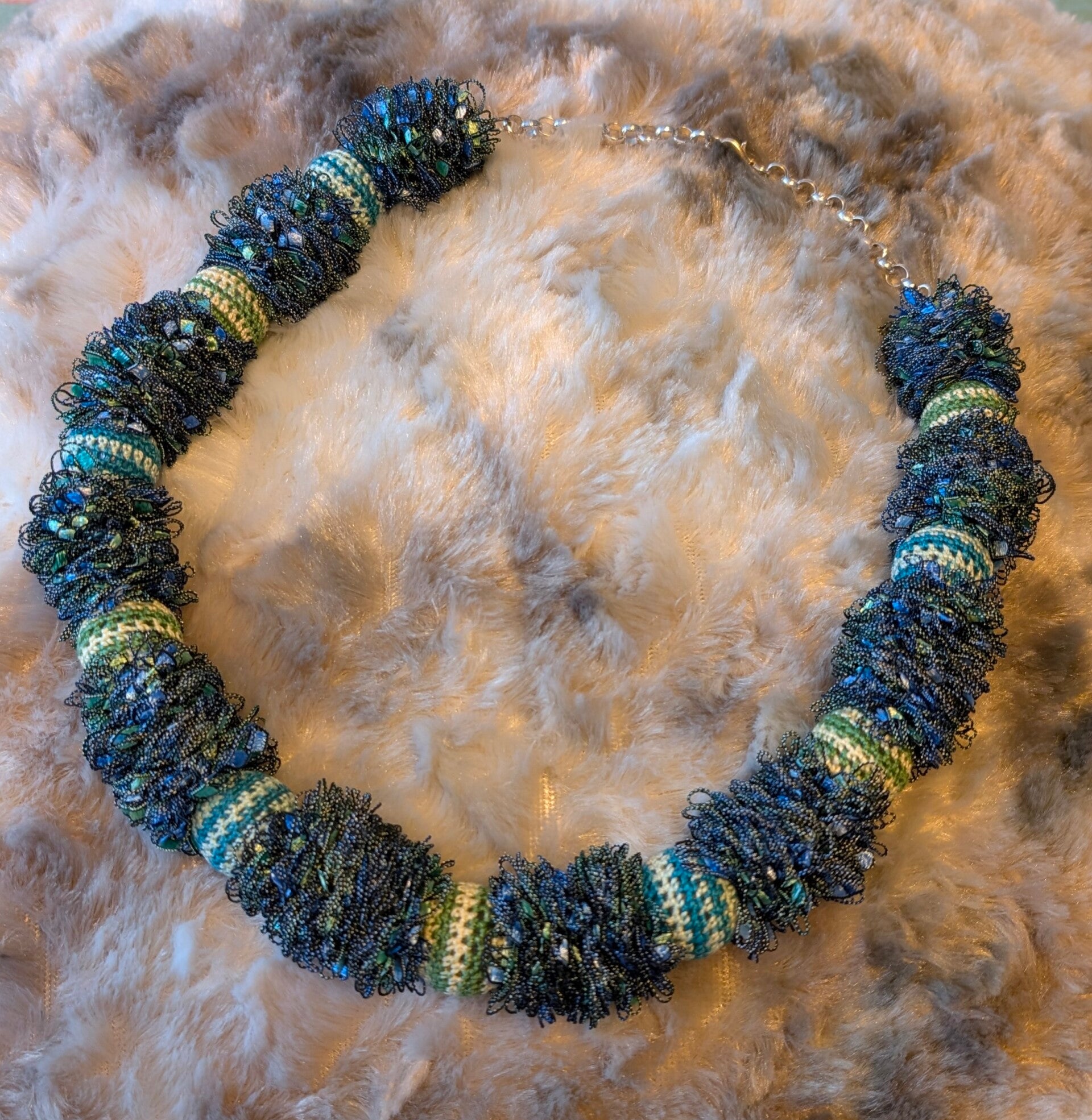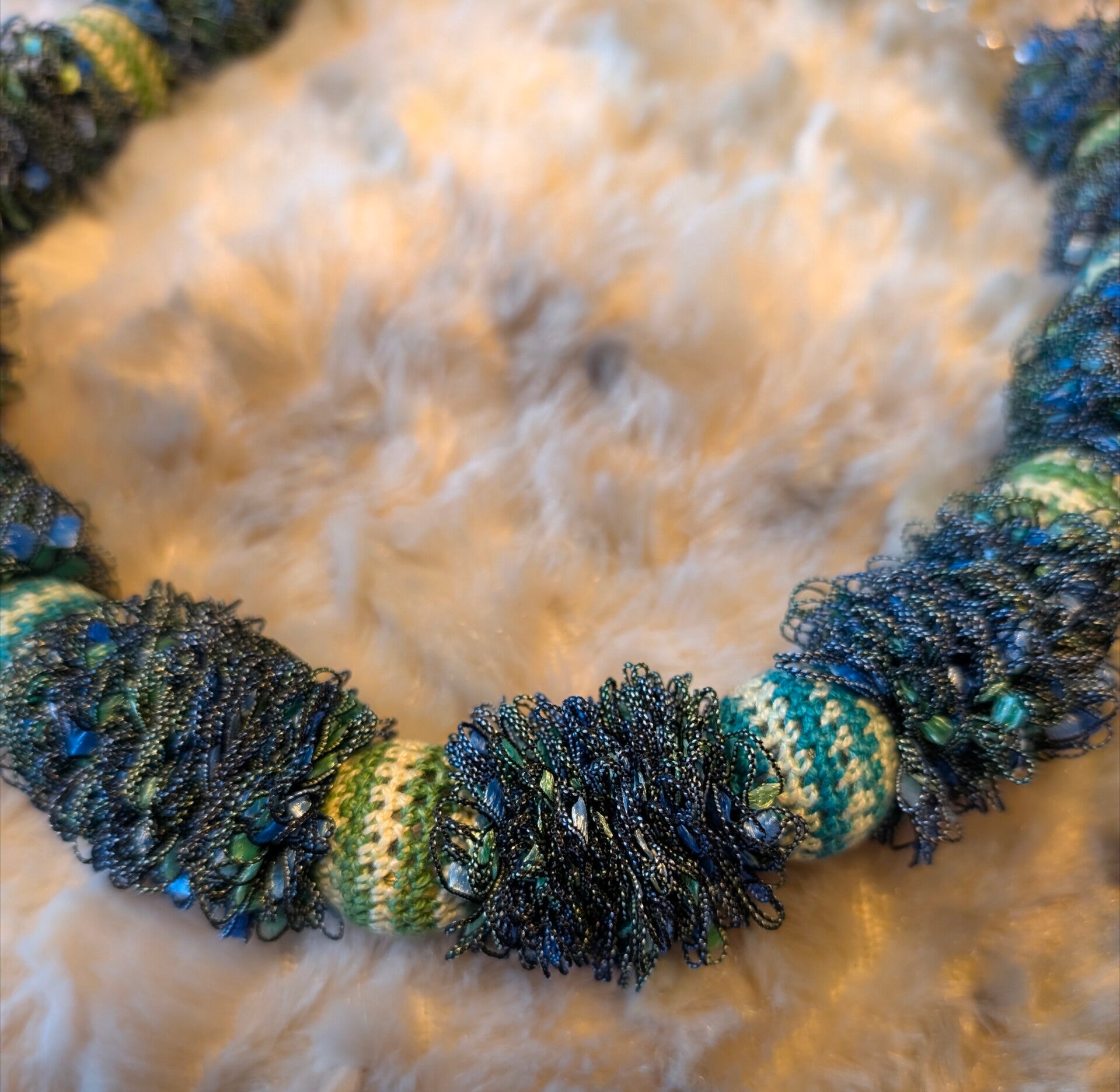 De ketting is uitgevoerd in frisse groen- en blauwtinten en gemaakt van licht, zacht garen dat met zorg om draad is verwerkt. Over de lengte van de ketting zijn tien handgehaakte kralen geplaatst, subtiel verdeeld - ongeveer om de vijf cm - waardoor er een mooi ritme en een speels, maar rustig geheel ontstaat.
