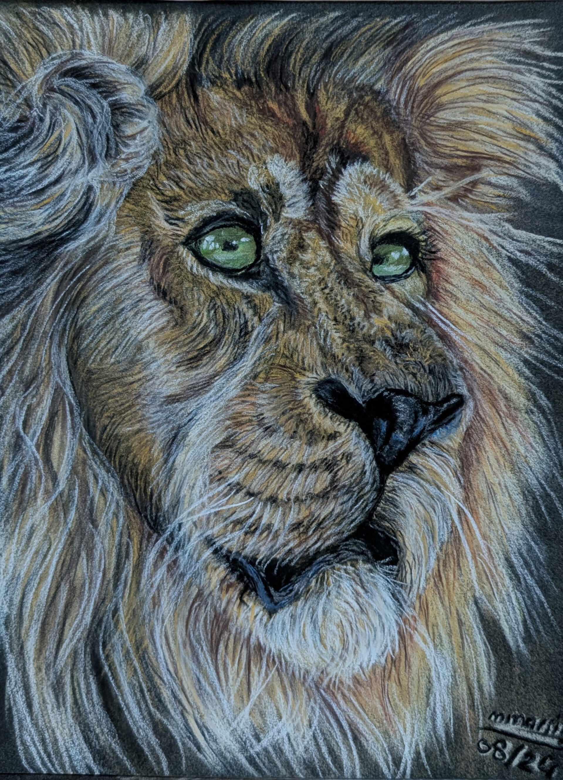 Deze handgetekende leeuw is uitgevoerd in soft pastel en met zorg uitgewerkt tot een krachtig en warm portret. De mooie pasteltinten geven het werk diepte en expressie, terwijl de blik van de leeuw zowel rust als kracht uitstraalt.