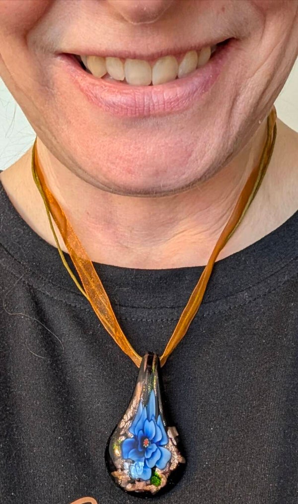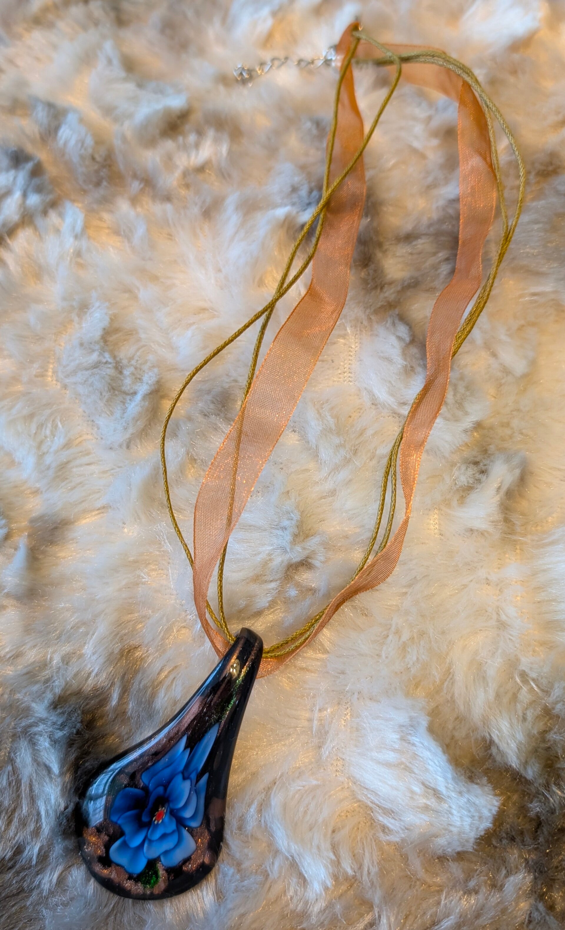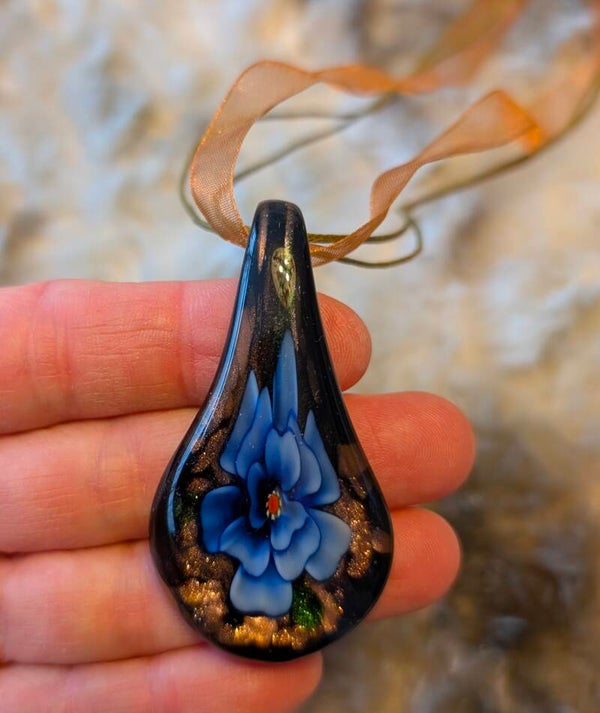 De rijke donkere tinten met subtiele glinstering geven het sieraad een warme, mysterieuze uitstraling, terwijl de blauwe bloem helder naar voren komt in het licht.