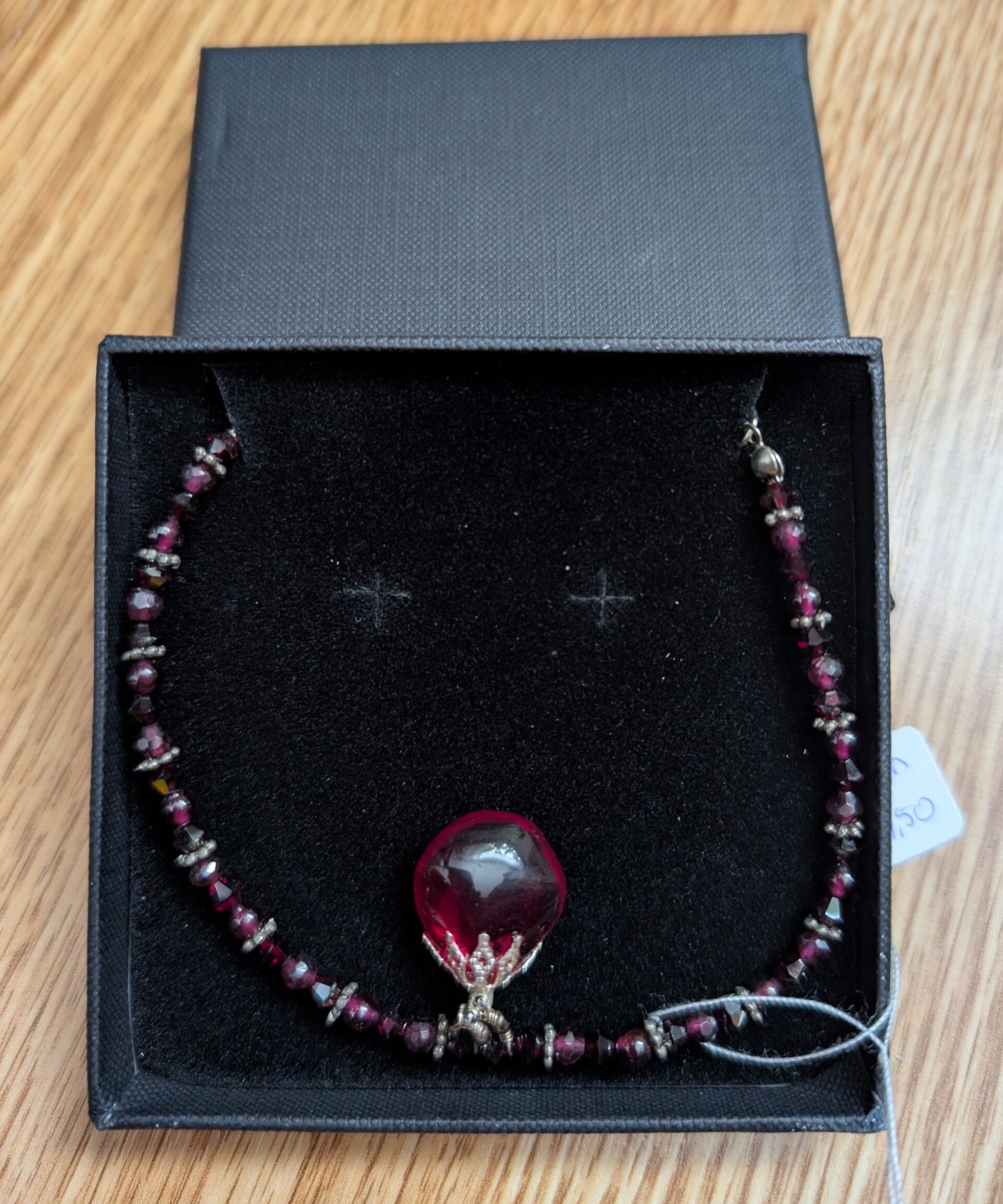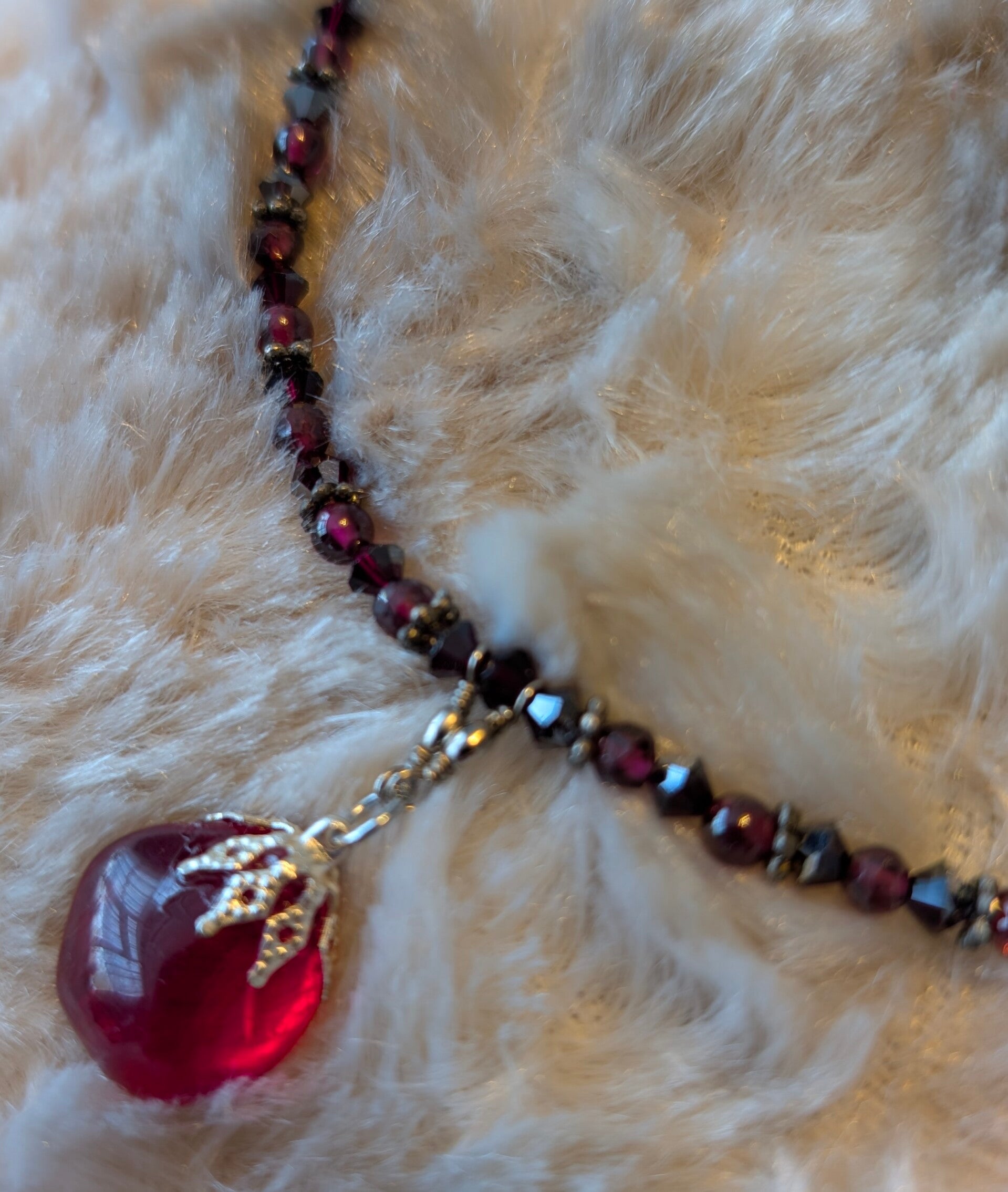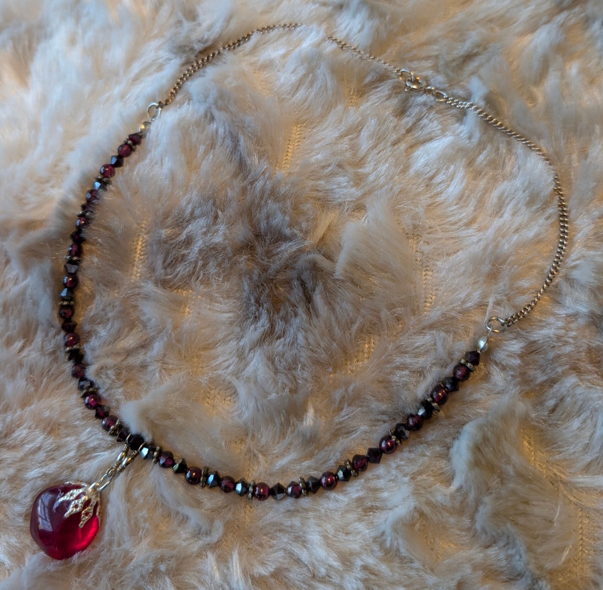 Soms spreekt eenvoud het luidst. Deze handgemaakte ketting combineert de diepe, mystieke kleur van een getrommeld robijntje met de schittering van facetgeslepen kristallen. De afwisseling van kristal- en glaskraaltjes zorgt voor een verfijnd detail, terwijl de zilveren ketting het ontwerp een moderne en luchtige finish geeft.