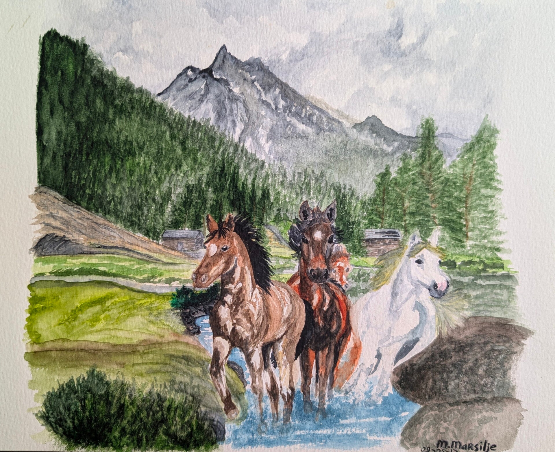 Breng de wildernis in huis met dit unieke aquarel van drie galloperende paarden in een berglandschap. De zachte overgangen van de aquarelverf en de dynamiek van het opspattende water maken dit een levendig kunstwerk dat direct de aandacht trekt.