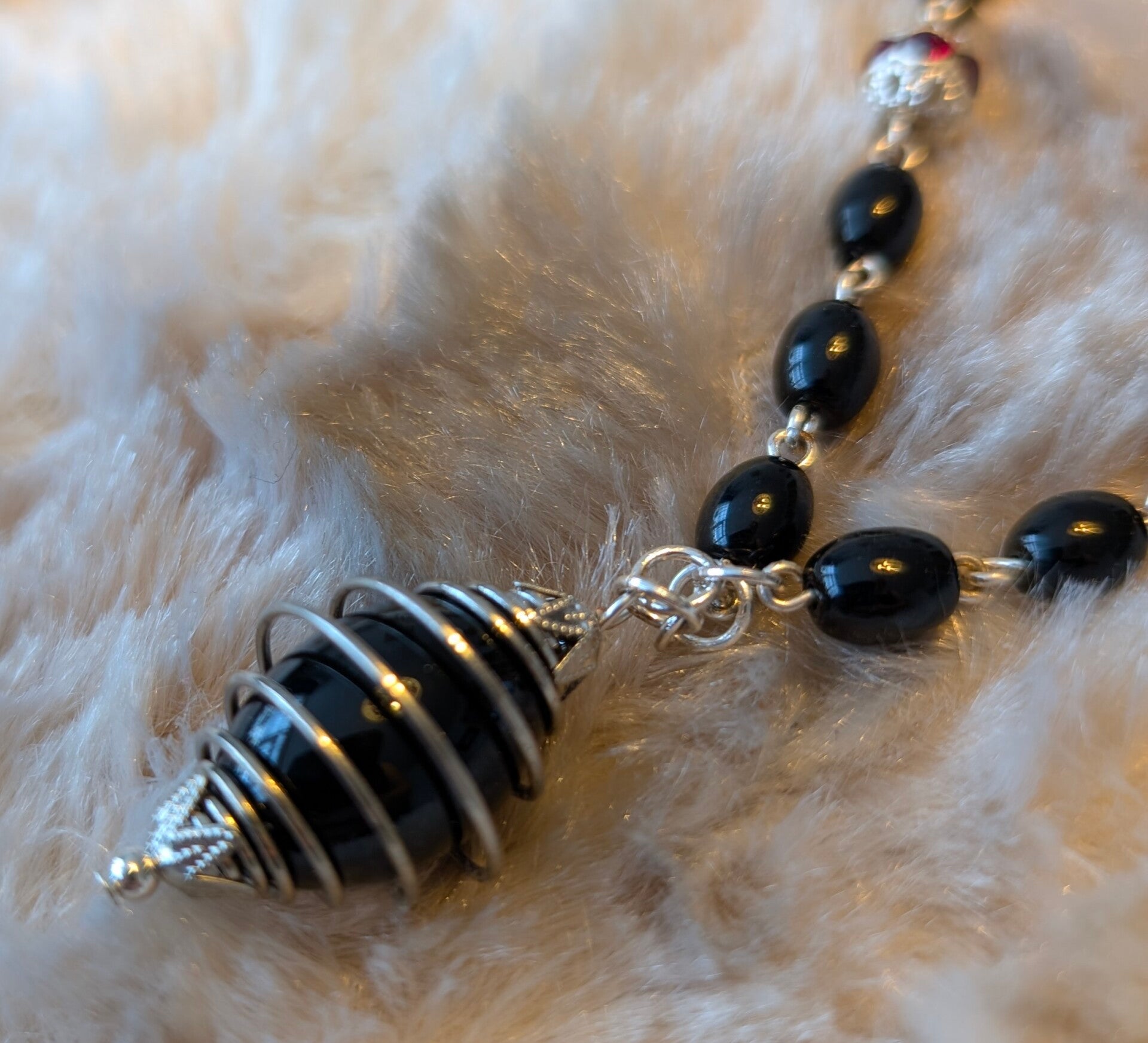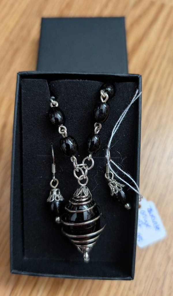Deze handgemaakte ketting met bijpassende oorbellen is ontworpen met diepe zwarte Onyx en verfijnd verzilverd sieradenmetaaldraad. Het middelpunt - een met de hand gewikkelde hanger - omarmt de steen als een beschermende cocon. Krachtig, mysterieus en elegant.