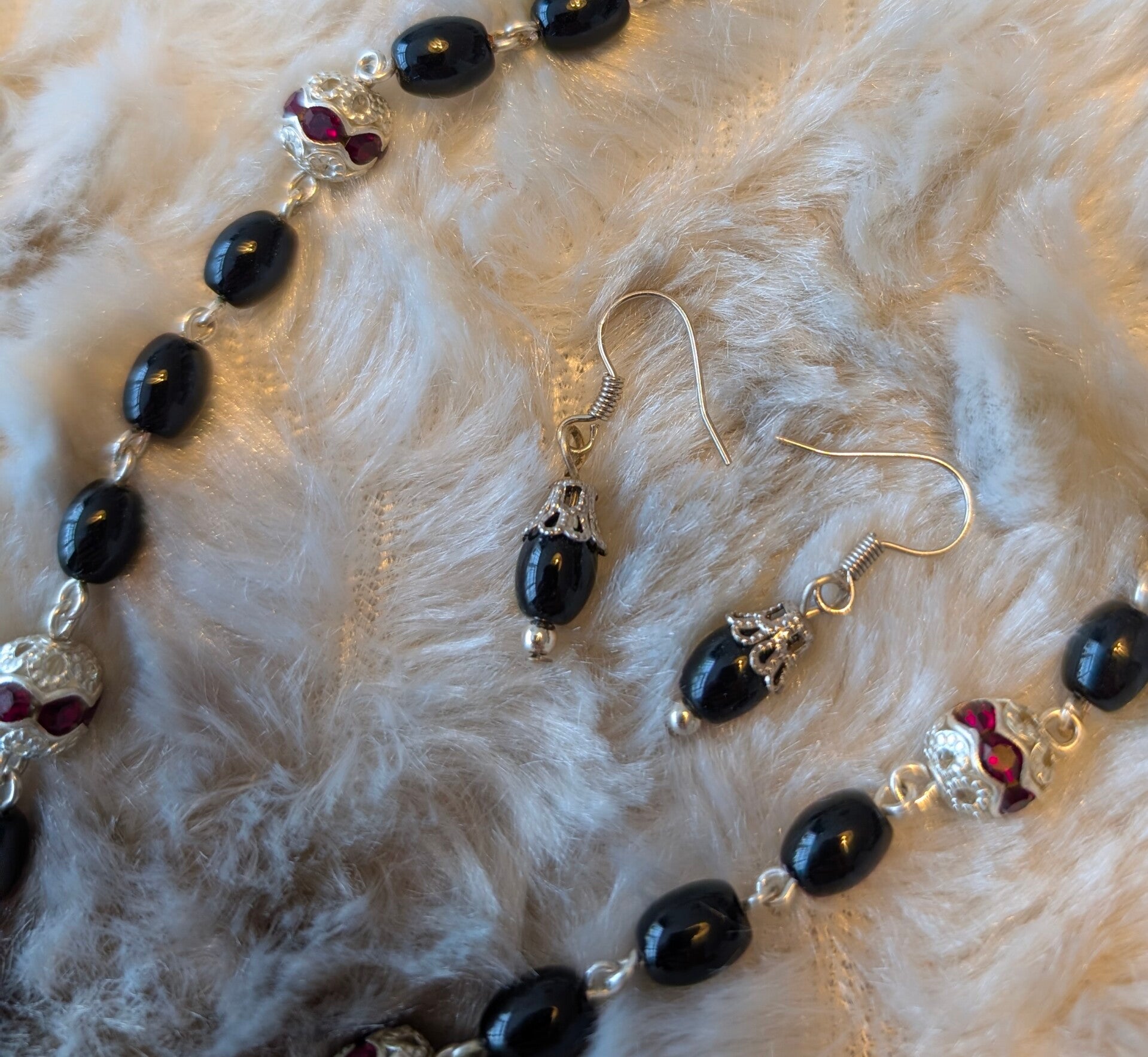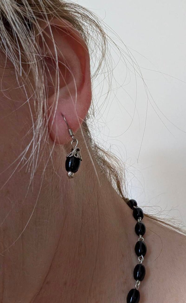 Ketting & Oorbellen "Night Guardian" - Zwarte onyx en verzilverd draadwerk